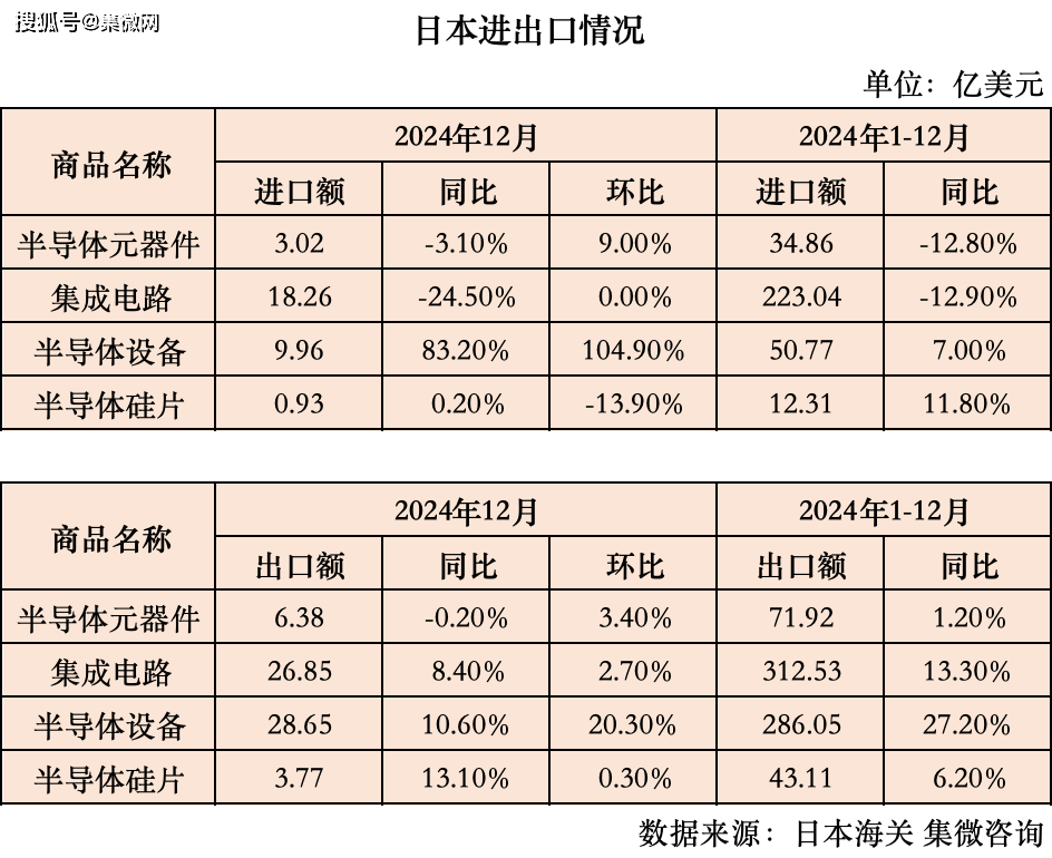 2024年1-12月,日本半导体器件出口金额71。92亿美元,集成电出口金额312。53亿美元,半导体设备出口金额286。05亿美元,半导体硅片出口金额43。11亿美元。12月,集成电出口金额26。85亿美元,半导体设备出口金额28。65亿美元,半导体硅片出口金额3。77亿美元。