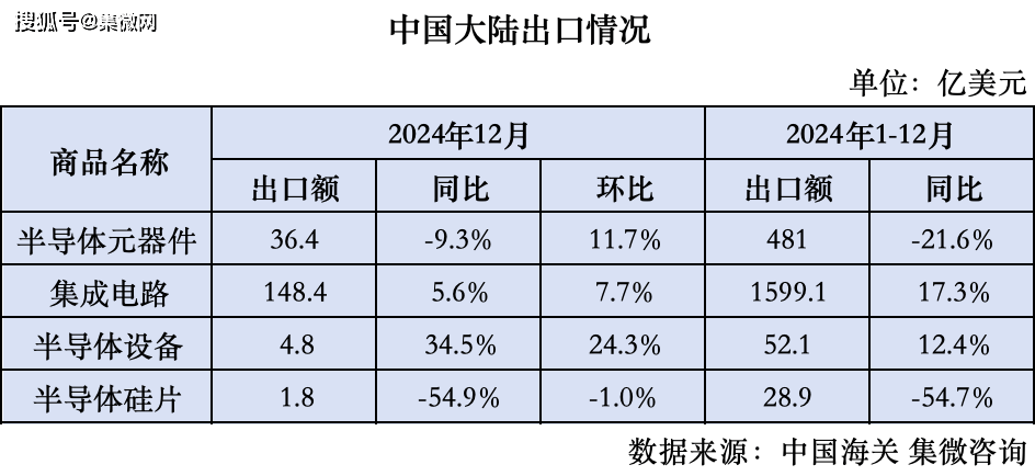 2024年1-12月,中国半导体器件出口金45。09亿美元,集成电出口金额1650。42亿美元,半导体设备出口金额49。49亿美元,半导体硅片出口金额10。72亿美元。12月,中国半导体器件出口金额3。71亿美元,集成电出口金额161。89亿美元,半导体设备出口金额4。08亿美元,半导体硅片出口金额0。87亿美元。