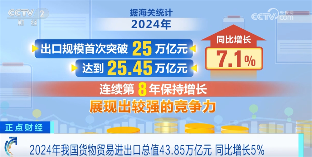 对外经贸大学中国世界商业组织研究院院长屠新泉称:“2024年我国外贸进出口成就亮眼,外贸总量、增量和质量都获得显著提拔。进出口商业额创出新高,全年实现商业顺差跨越1万亿美元。出格是这些成就是正在我国曾经具有40万亿庞大存量的根本上取得,实为难能宝贵。”正在13日上午国新办举行的旧事发布会上,海关总署副署长王令浚引见,2024年我国货色商业进出口总值43。85万亿元,总量、增量、质量“三量”齐升,规模再创汗青新高。2024年,我国货色商业进出口总值43。85万亿元,此中,出口规模达到25。45万亿元,同比增加7。1%,持续第8年连结增加。进口18。39万亿元,同比增加2。3%。