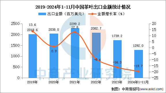 中商谍报网讯:据中商财产研究院数据库显示,2023年我国茶叶的出口量小幅下降,降至367542吨。最新数据显示,2024年1-11月中国茶叶出口量339658吨,同比增加1。1%。数据显示,2024年1-11月中国茶叶出口金额1292百万美元,同比下降19。7%。更多材料请参考中商财产研究院发布的《中国茶叶市场前景及投资机遇研究演讲》,同时中商财产研究院还供给财产大数据、行业研究演讲、行业、行业地位证明、可行性研究演讲财产规划、财产链招商图谱、财产招商、财产链招商调查&推介会、“十五五”规划等征询办事。