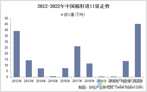 我国棉籽进口量变更而言,我国棉籽进口量远高于出口量,现实进口量受全体市场影响较大,而棉籽市场行情总体上受国际大豆商业、食用油出产,以及其他农产操行情波动的影响。近两年跟着国内全体粮油需求走高,带动棉籽进口量大增,2021-2022年我国棉籽进口量别离为13。7万吨和45。4万吨,此中2022年进口量达近十年新高。