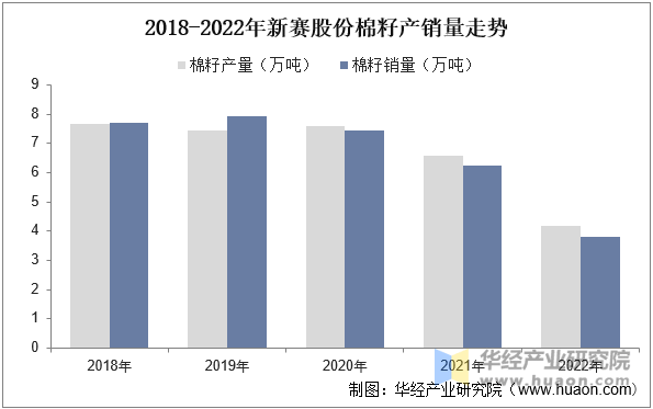 新赛股份从停业务是棉花成品出产、加工,棉籽是出产加工过程中的次要产物之一,新赛股份出产所得棉籽大部门对外发卖,部门则给企业棉籽油、棉粕、棉籽卵白等棉籽加工产物出产供给原料。近两年跟着全体棉籽供给波动,新赛股份全体棉籽产销量有所下降,库存上升至近年高位的8千吨以上,2021年全体发卖均价走高,现实棉籽营收仍表示为增加态势,2022年全体价钱高位布景下需求不振,棉籽营收下降超4成,仅为1。01亿元。