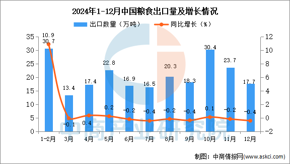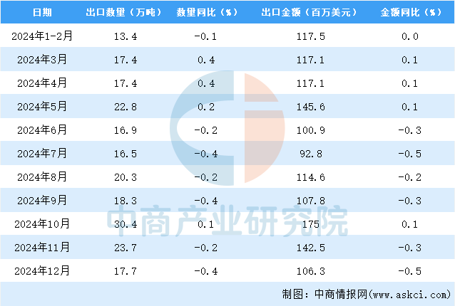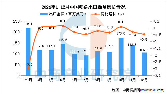 中商谍报网讯:据中商财产研究院数据库显示,2024年12月中国粮食出口量17。7万吨,同比下降13。7%。从金额方面来看,2024年12月中国粮食出口金额106。3百万美元,取客岁同比下降0。5%;1-12月我国粮食累计出口金额1430。8百万美元,同比下降18。9%。